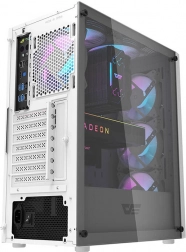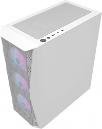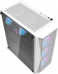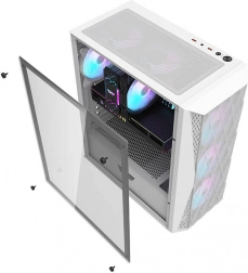 Ta obudowa wyróżnia się przezroczystym bocznym panelem i przednim panelem z siatkową strukturą, nadającym nowoczesny przemysłowy wygląd.