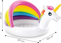 Uroczy nadmuchiwany basenik w kształcie jednorożca z tęczowym daszkiem marki INTEX ucieszy najmłodszych miłośników wody. Oferuje miękkie, nadmuchiwane dno dla wygody, wytrzymały winyl 0,25 mm dla bezpieczeństwa oraz kompaktowe wymiary 127 × 102 × 69 cm. Dzięki daszkowi zapewnia przyjemny cień, a przy pojemności 45 l jest idealny dla dzieci w wieku 1–3 lat (wyłącznie pod nadzorem osoby dorosłej).