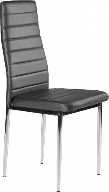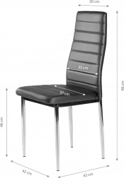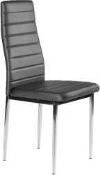 Szara tapicerka z ekoskóry i chromowane nogi tworzą eleganckie połączenie, które pasuje do nowoczesnej jadalni, kuchni oraz przestrzeni publicznych.