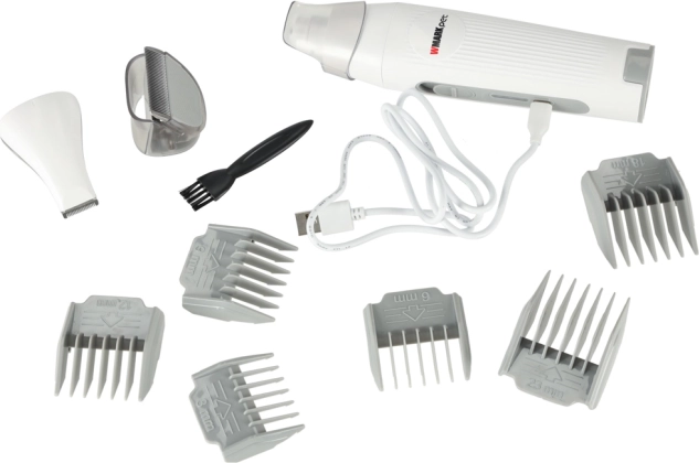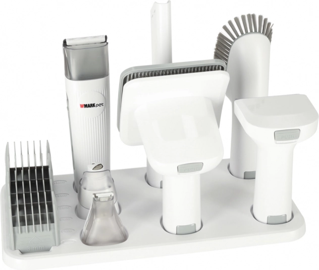 Bezprzewodowa maszynka WMARK Pet z 6 nasadkami grzebieniowymi (3–23 mm), szczotkami, trymerem do łap i pilnikiem do pazurów – wszystko w jednym zestawie.