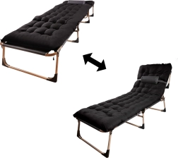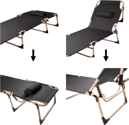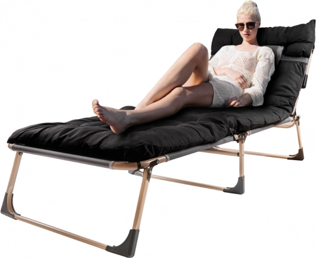Ciesz się wygodnym odpoczynkiem gdziekolwiek – na tarasie, na kempingu i w ogrodzie. Składane łóżko turystyczne z materacem łączy stabilną stalową ramę i wytrzymałe pokrycie z tkaniny Oxford 1200D o wodoodporności 3000 Pa. Dzięki oparciu regulowanemu w 4 stopniach wykorzystasz je jako leżak lub łóżko.
