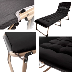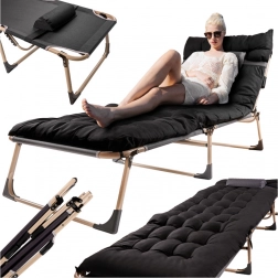 Wygodne i wytrzymałe składane łóżko do kempingu, na taras i do ogrodu. Ma stalową ramę malowaną proszkowo, 4‑stopniową regulację oparcia oraz mocną tkaninę Oxford 1200D. W zestawie znajduje się miękki materac i mała poduszka dla maksymalnego komfortu. Łatwe składanie i przenoszenie – idealne do auta lub kampera.