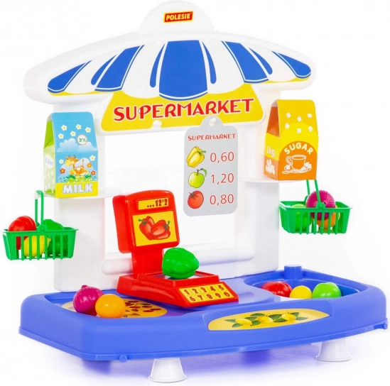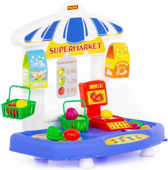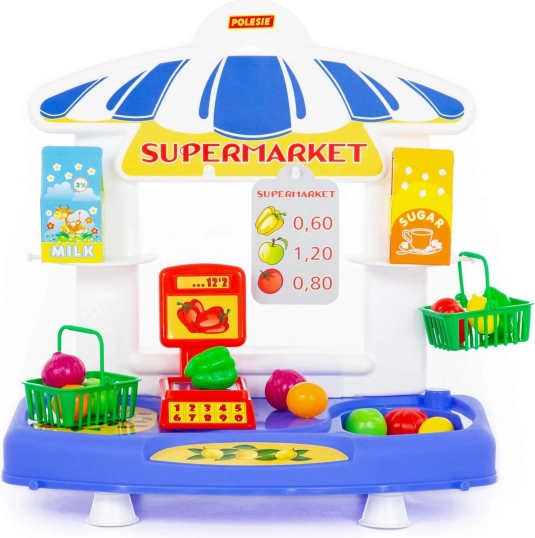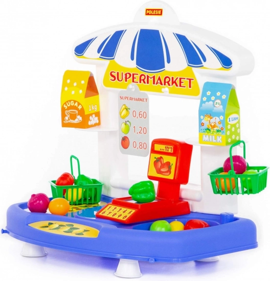 - Bogate akcesoria: koszyki, lada z wagą, owoce i warzywa, pudełka „mleko” i „cukier”.