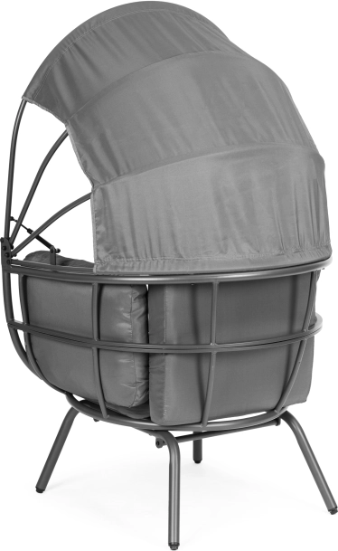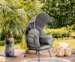 Ogrodowy fotel ModernHome zapewnia luksusowy wypoczynek na świeżym powietrzu dzięki miękkim poduszkom i składanemu daszkowi, który chroni przed słońcem i wiatrem.