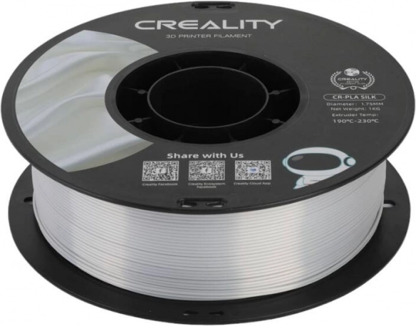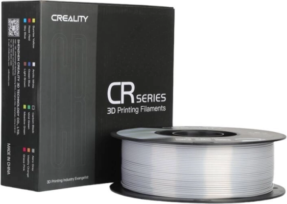 Błyszczący filament Creality CR-PLA Silk w kolorze srebrnym zapewnia metaliczny, elegancki połysk do figurek, dekoracji i biżuterii. Oferuje szybki i płynny druk do 100 mm/s, odporność na plątanie, niskie skurcze i jest wykonany z ekologicznego PLA. Kompatybilny z większością drukarek CREALITY.