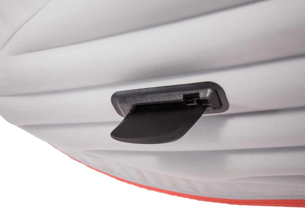 Praktyczne wyposażenie obejmuje zintegrowane uchwyty na wędki, przestrzenie bagażowe na dziobie i rufie z nierdzewnym kółkiem do zabezpieczenia ekwipunku oraz zdejmowaną płetwę kierunkową dla lepszego trzymania kursu. W zestawie znajduje się wszystko, czego potrzeba do natychmiastowego wypłynięcia – ręczna pompka i dwa wiosła – a łatwy transport zapewnia torba transportowa.