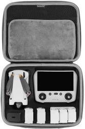 Torba zawiera oddzielne przegródki na drona, kontroler i akcesoria, zapewniając ich bezpieczne przechowywanie.