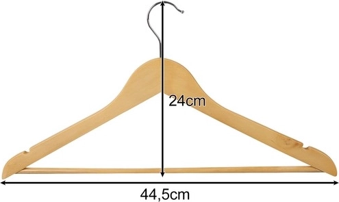 Zestaw 10 drewnianych wieszaków łączy ponadczasowy wygląd i wysoką trwałość. Wieszaki wykonano z litego drewna i zabezpieczono bezbarwnym lakierem, który podkreśla naturalny rysunek, a jednocześnie chroni przed wilgocią i drobnymi zarysowaniami. Nadadzą Twojej garderobie czystość, porządek i elegancki wygląd.