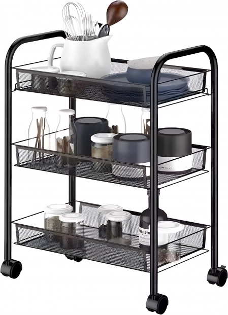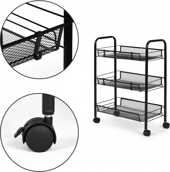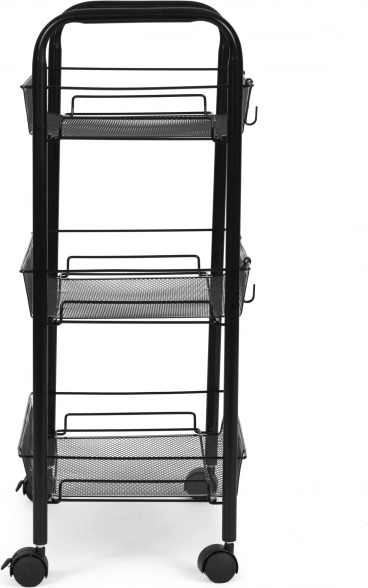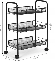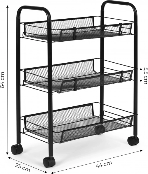 Praktyczny i stylowy pomocnik dla każdego domu. Smukłe proporcje regału pozwalają wykorzystać nawet mniej dostępne miejsca, a trzy pojemne koszykowe półki pomieszczą kosmetyki, środki czystości, przyprawy, naczynia czy artykuły biurowe. Wytrzymały metal gwarantuje stabilność i długą żywotność.