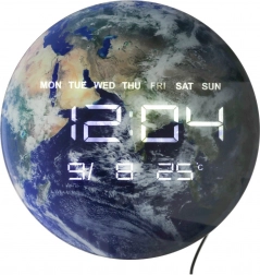 Stylowy zegar ścienny w kształcie Ziemi wprowadzi do wnętrza niebanalny design i świetną czytelność. Zintegrowany wyświetlacz LED pokazuje nie tylko czas w formacie 12/24 h, ale także datę, dzień tygodnia oraz temperaturę w pomieszczeniu. Stabilne zasilanie sieciowe zapewnia nieprzerwalaną pracę, a baterię zapasową CR2032 utrzymuje ustawienia przy zaniku zasilania.