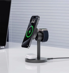 Bezprzewodowa ładowarka Aukey MagFusion 3 w 1 umożliwia ładowanie nawet trzech urządzeń naraz z mocą do 15 W, co gwarantuje szybkie i efektywne zasilanie. Technologia Qi2 z wyrównaniem magnetycznym minimalizuje straty energii.
