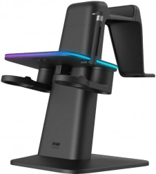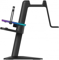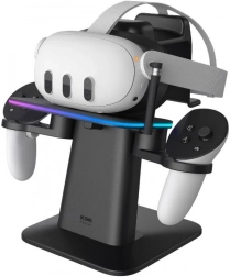 Elegancki czarny stojak z oświetleniem RGB łączy ładowanie i organizację Twojego zestawu VR w jednym miejscu. Magnetyczny konektor zapewnia bezpieczne i wygodne zasilanie gogli META QUEST, a boczne uchwyty utrzymują kontrolery pod ręką. Dzięki 16 efektom świetlnym dostosujesz atmosferę swojego kącika gamingowego.