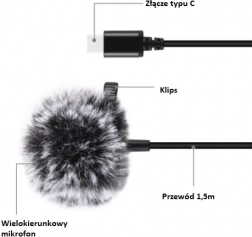 Mikrofon jest wyposażony w złącze USB‑C, co zapewnia szeroką kompatybilność ze współczesnymi urządzeniami mobilnymi. W zestawie otrzymujesz: