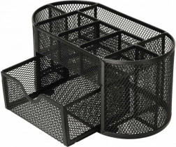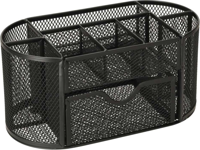 Praktyczny organizer na biurko z wytrzymałej metalowej siatki pomoże ci mieć wszystko pod ręką i na swoim miejscu. Dziewięć sprytnie podzielonych przegródek pomieści ołówki, nożyczki, linijki, spinacze i karteczki samoprzylepne, a wysuwana szuflada idealnie nadaje się na drobiazgi i karteczki z notatkami. Dzięki otwartej konstrukcji zawsze masz pełen wgląd w zawartość.