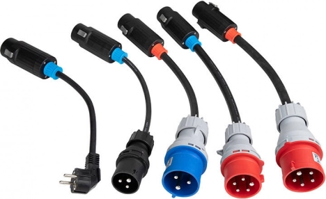 - Szeroka gama adapterów do różnych gniazd (CEE, Schuko, UK)