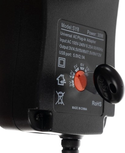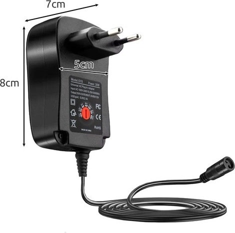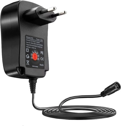 Uniwersalny adapter z regulowanym wyjściowym napięciem (od 3V do 12V) to doskonałe rozwiązanie do zasilania urządzeń zarówno w domu, jak i w środowisku profesjonalnym. Dołączone klucze umożliwiają dokładną regulację wyjściowej mocy. Charakterystyczny klik informuje o poprawnym ustawieniu.