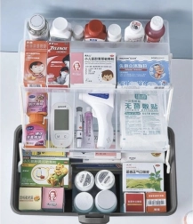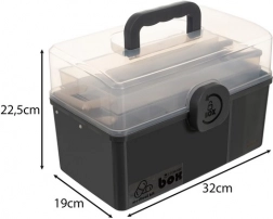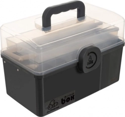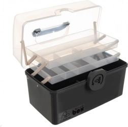 Dwupoziomowe, rozkładane półki z przegródkami są idealne na tabletki, maści, plastry oraz kosmetyki. Dolna komora oferuje dużo miejsca na większe butelki i opakowania. Lekka konstrukcja i ergonomiczna rączka ułatwiają przenoszenie w domu i w podróży.