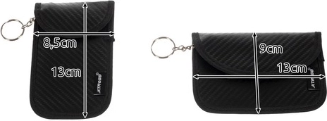 Każde etui ma dwie oddzielne kieszenie – głębszą z kółkiem na klucz samochodowy (ekranowaną) oraz mniejszą na karty płatnicze i dostępowe. Wytrzymała powierzchnia z PU o wyglądzie karbonu, miękkie wypełnienie z poliestru oraz solidny rzep chronią zawartość przed uszkodzeniem i przypadkowym wypadnięciem. Zestaw zawiera wariant pionowy i poziomy; wersja pozioma ma dodatkowo tylny uchwyt do przypięcia do torby lub plecaka.