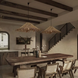 To designerskie zwieszane oświetlenie z naturalnego rattanu wprowadza do wnętrza ciepłe, przytulne światło oraz autentyczny, naturalny charakter. Organiczna faktura i forma słomianego kapelusza czynią z niego oryginalny dodatek do kuchni, jadalni, salonu i sypialni.