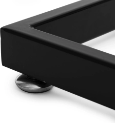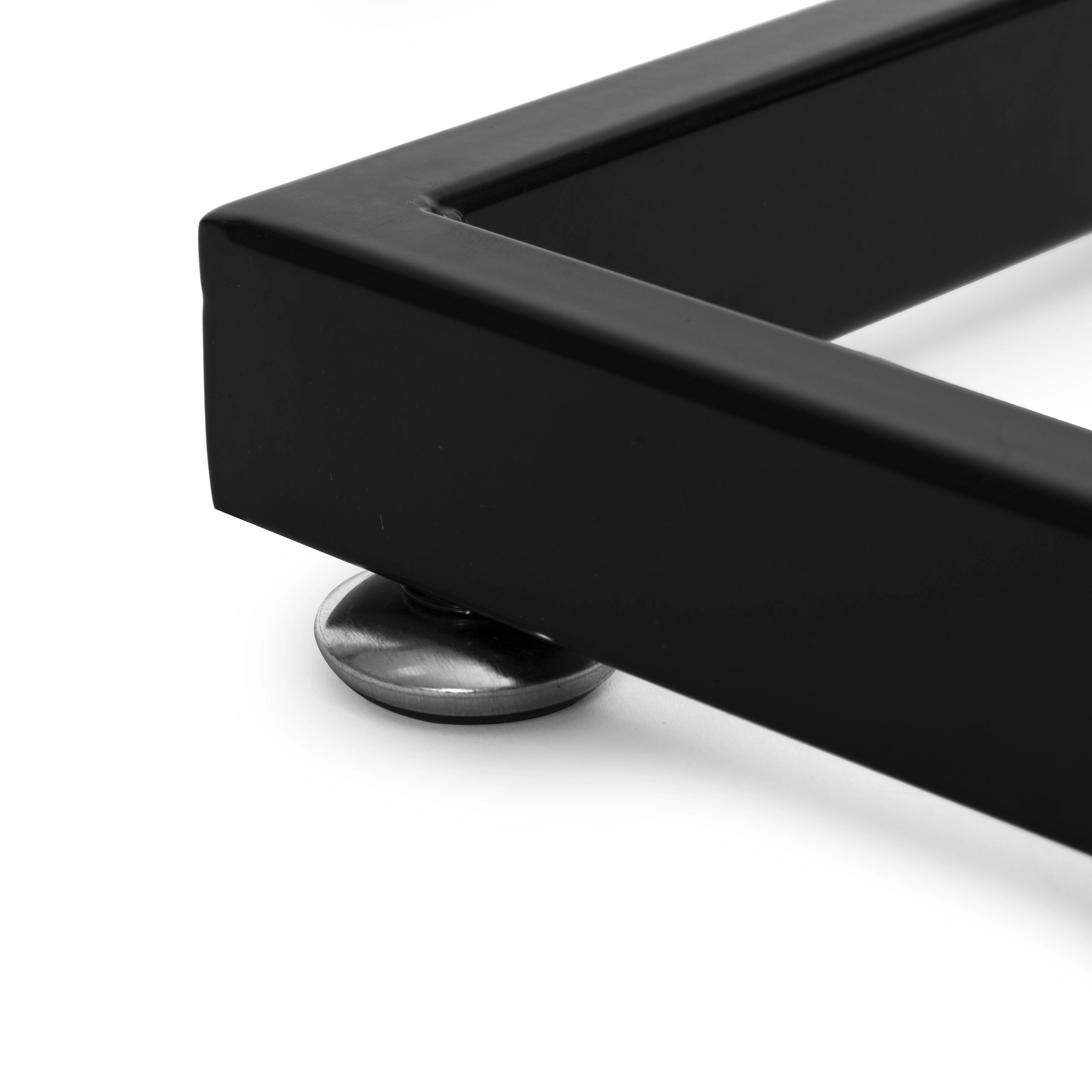 Solidna prostokątna podstawa z profili metalowych utrzymuje wieszak stabilnie nawet przy pełnym obciążeniu. Regulowane nóżki poziomujące chronią podłogi przed uszkodzeniem i pomagają wypoziomować wieszak na nierównej powierzchni. Prosty, uniwersalny design łatwo komponuje się z nowoczesnymi wnętrzami.