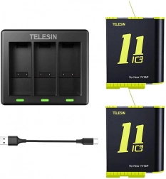 Zestaw zawiera: trzykanałową ładowarkę Telesin, 2× akumulator 1750 mAh, kabel USB‑C.