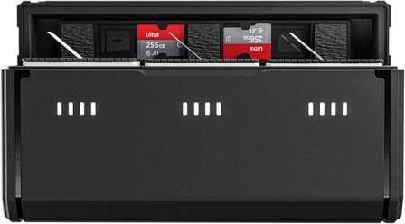 Zintegrowane przegrody mieszczą baterie, a dwa sloty na karty pamięci zapewniają porządek i ochronę w transporcie.