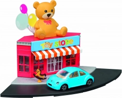 - Plastikowy budynek sklepu z zabawkami, metalowy model auta 1:43, elementy uliczne i chodnikowe, akcesoria