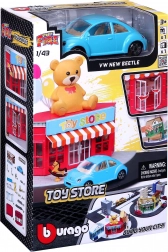 Zbuduj własne miasto z zestawem do zabawy Bburago City Sklep z zabawkami 1:43. Metalowy model auta w skali 1:43, plastikowy budynek z ruchomymi drzwiami, elementy uliczne i chodnikowe oraz różne akcesoria do kreatywnej zabawy. Zestaw można łączyć z innymi setami z serii StreetFire.