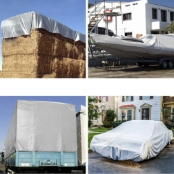 Idealna jako osłona przed deszczem i słońcem dla samochodów, łodzi, ładunku, drewna lub na budowie. Dwustronna plandeka w kolorze srebrnym/szarym.