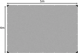 Narożniki są wzmocnione plastikowymi protektorami, a na obwodzie znajdują się nierdzewne oczka Ø 12 mm rozmieszczone co ok. 100 cm – przy wymiarze 4 × 5 m łącznie 18 oczek. Plandeka jest dwustronna i świetnie sprawdzi się jako tymczasowe zadaszenie, ochrona materiałów, przykrycie ładunku czy osłona przed warunkami atmosferycznymi.