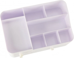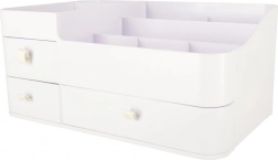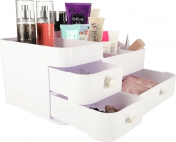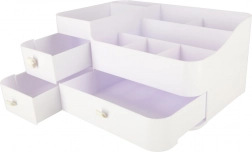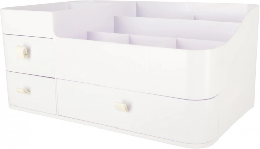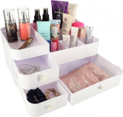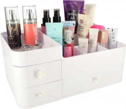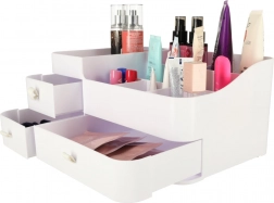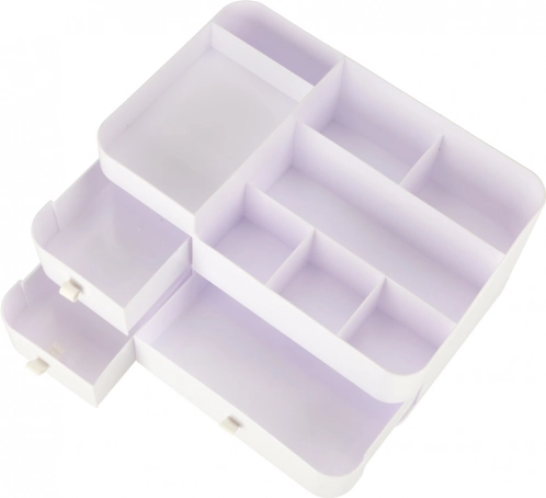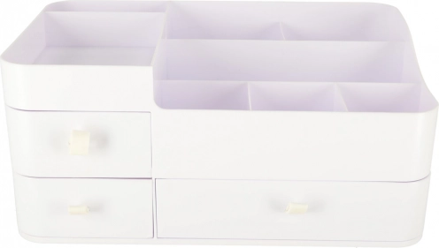 Ułóż codzienną pielęgnację z pojemnym organizerem, który łączy praktyczny podział i czysty, nowoczesny wygląd. Trzy gładko wysuwane szuflady są idealne na palety, waciki czy biżuterię, a górne siedem przegródek utrzyma pod ręką pędzle, pomadki, tusze oraz flakoniki perfum.