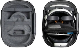 Etui zaskakuje pojemnością: bez trudu mieści gogle Meta Quest 3 z paskiem S3 Pro, kontrolery z gripami oraz stację dokującą. Wewnętrzna siatkowana kieszeń na zamek idealnie nadaje się na ładowarki, przewody i drobiazgi – wszystko pozostaje przejrzyste i pod ręką. Dzięki odpinanemu paskowi na ramię możesz nosić C3 jak aktówkę lub przez ramię i podróżować z maksymalnym komfortem.