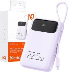 Kompaktowa powerbank Mcdodo o pojemności 10 000 mAh i mocy 22,5 W szybko naładuje telefon oraz akcesoria. Ma zintegrowany kabel Lightning, port USB‑C, czytelny wyświetlacz LCD i umożliwia ładowanie nawet 3 urządzeń jednocześnie. Wspiera PD 3.0, QC 3.0 i SCP 22,5 W, spełnia międzynarodowe standardy bezpieczeństwa i nadaje się także do podróży samolotem.