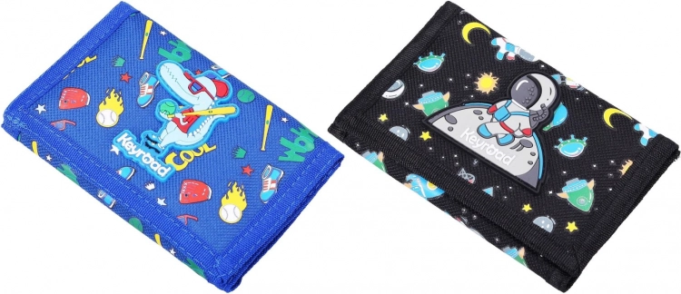 Praktyczny materiałowy portfel z zapięciem na rzep w kompaktowym rozmiarze 12,5 × 8 cm jest idealny dla dzieci i uczniów. Do wyboru są 2 atrakcyjne motywy – niebieski z dinozaurem oraz czarny z kosmonautą. Portfel jest lekki, trwały i łatwo mieści się w kieszeni lub szkolnym plecaku.