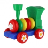 Pociąg jest wykonany z plastiku w intensywnych kolorach, które przyciągają uwagę dzieci, ozdobiony kwiatowymi motywami na kołach.