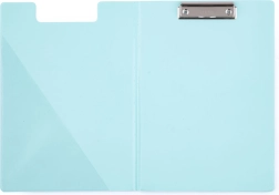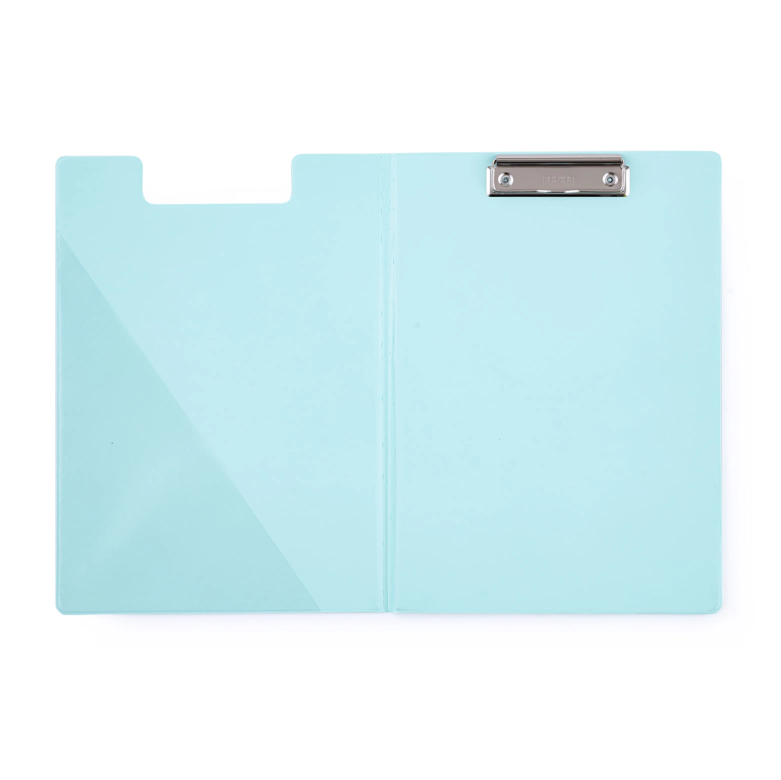 Nowoczesna zamykana podkładka do pisania z metalowym klipem w pastelowej zieleni, wykonana z ekstra wytrzymałej tektury z wewnętrzną przezroczystą kieszenią.