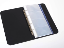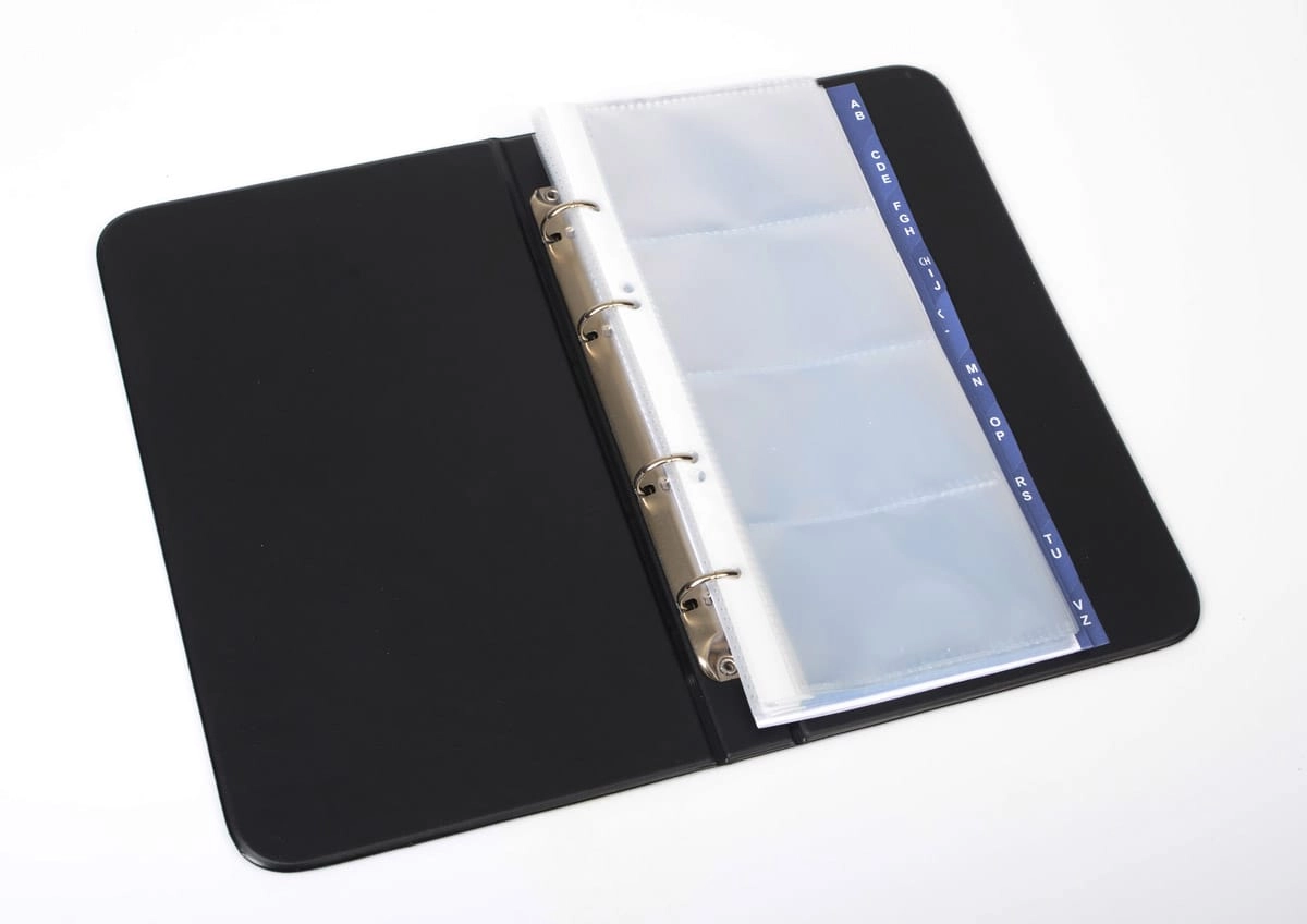 Popularny wizytownik z mechanizmem ringowym i wewnętrznymi wkładami na maksymalnie 80 sztuk wizytówek. Uzupełniony indeksem A–Z.