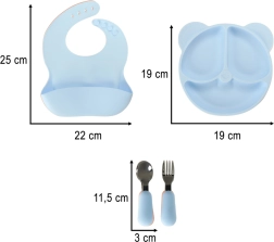 Praktyczny, 4-częściowy silikonowy zestaw naczyń dla dzieci w kolorze niebieskim z uroczym motywem misia zapewnia wygodne i bezpieczne posiłki. Zawiera dzielony talerz, śliniak z kieszonką oraz ergonomiczne sztućce z antypoślizgowym wykończeniem. Wykonany z silikonu przeznaczonego do kontaktu z żywnością, wolnego od szkodliwych substancji; łatwy w czyszczeniu i wspiera samodzielne jedzenie.