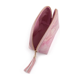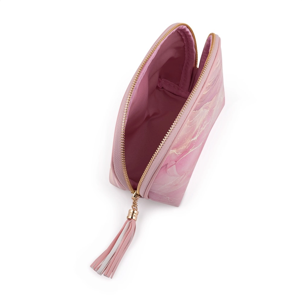 Ta elegancka podróżna kosmetyczka jest idealna na co dzień oraz na weekendowe wyjazdy. Okrągły kształt i różowe wykończenie z marmurowym wzorem sprawiają, że to gustowny dodatek, który łatwo zmieścisz w torebce, plecaku czy bagażu podręcznym.
