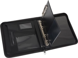 Elegancka teczka w formacie A5 w matowej czerni jest idealna do codziennej organizacji dokumentów. Oferuje zamknięcie na zamek, wewnętrzne kieszenie na dokumenty i wizytówki, uchwyt na przybory do pisania oraz 4‑ringowy mechanizm typu D20 dla przejrzystego segregowania.