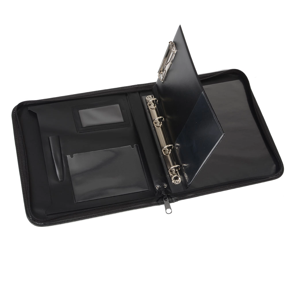 Ta stylowa teczka A5 w matowym czarnym wykończeniu bezpiecznie utrzymuje materiały dzięki praktycznemu zamkowi. Wewnętrzny układ z kieszeniami na dokumenty i wizytówki oraz uchwytem na przybory do pisania zapewnia doskonały porządek i szybki dostęp.