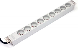 Solidna, aluminiowa listwa PDU do szafy 19" z 9 gniazdami typu E oraz kablem 1,8 m zakończonym wtykiem Schuko. Oferuje obciążalność 16 A, możliwość montażu pod różnymi kątami, połączenie kaskadowe i jest dostarczana z akcesoriami montażowymi do RACK.