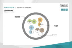- Kabel jest wykonany i testowany zgodnie ze specyfikacjami ISO/IEC 11801 klasy D oraz DIN EN 50173, co gwarantuje wysoką wydajność transmisji i zgodność z odpowiednią kategorią.