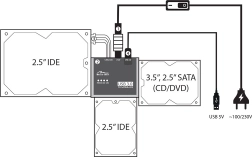 - 2.5"/3.5" SATA HDD/SSD, 2.5"/3.5" IDE HDD, napędy optyczne IDE/SATA (CD/DVD)