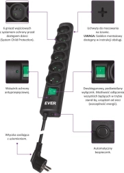 Dzięki listwie przeciwprzepięciowej Ever Optima zapewnisz bezpieczeństwo domowym urządzeniom, takim jak komputery stacjonarne i laptopy, urządzenia peryferyjne oraz sprzęt audiowizualny.