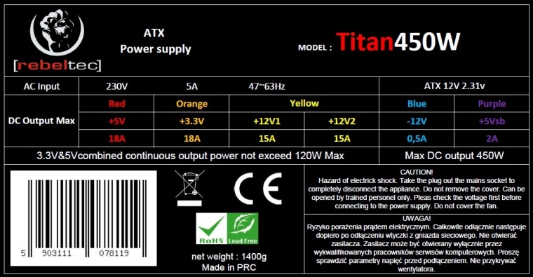 Uniwersalny zasilacz REBELTEC Titan 450W (ATX 2.31) z cichym wentylatorem 120 mm, bogatymi złączami i zabezpieczeniami OVP/SCP/UVP/OPP/PFC/OTP.