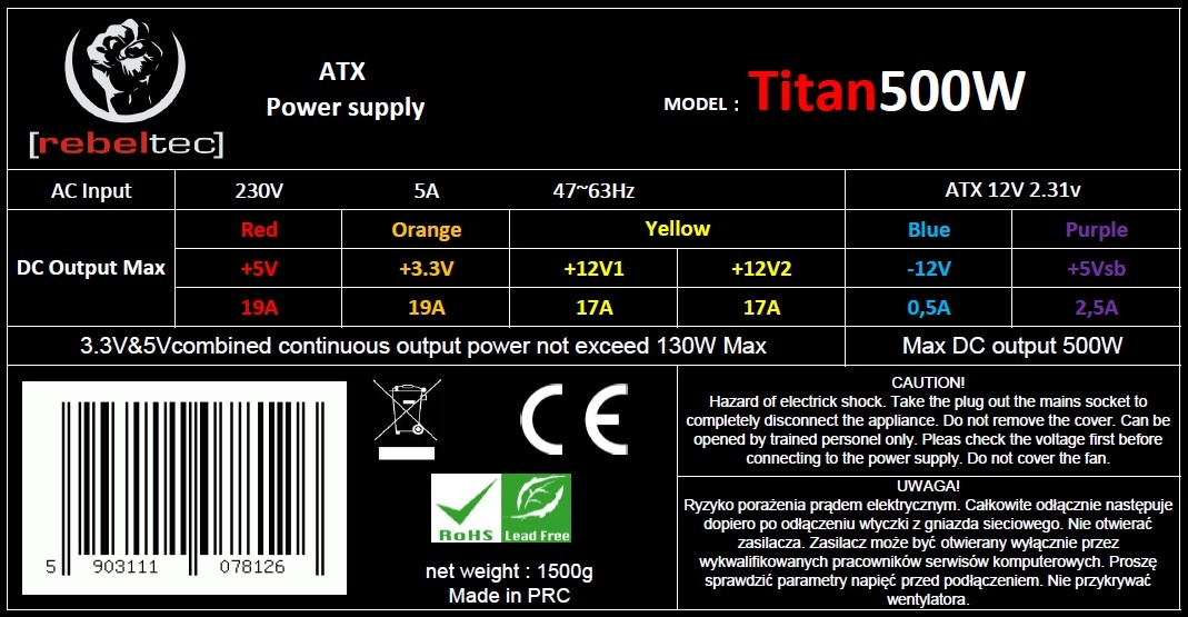 REBELTEC Titan 500 to uniwersalny zasilacz komputerowy ATX 2.31, który zapewnia maksymalną moc 500 W i stabilne zasilanie dla standardowych zestawów PC. Dzięki ultracichej pracy wentylatora 120 mm z regulacją termiczną utrzymuje niską temperaturę i hałas nawet pod obciążeniem.