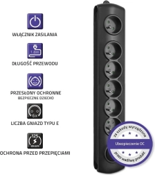 Nacisk na bezpieczeństwo zapewnia ochrona przeciwprzepięciowa z warystorem, zintegrowane zabezpieczenia przed dziećmi we wszystkich gniazdach oraz niezapalny materiał PP. Dzięki możliwości montażu do mebli i rozwiązaniu do nawinięcia nadmiarowego kabla utrzymasz okablowanie pod kontrolą, a przestrzeń będzie wyglądała czysto i estetycznie.