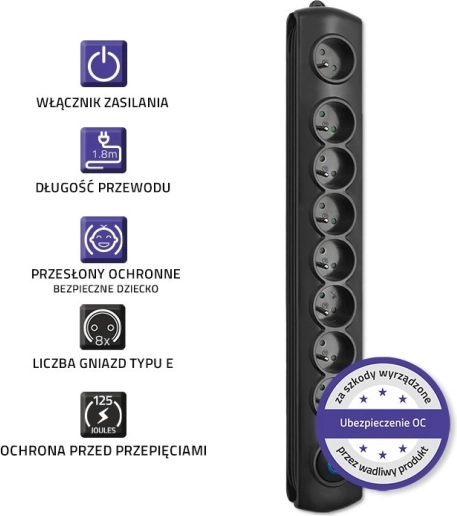 - 8 gniazd do jednoczesnego zasilania wielu urządzeń