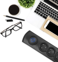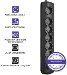Podświetlany nożny wyłącznik Quick Switch umożliwia łatwe i szybkie włączanie oraz wyłączanie zasilania bez schylania się – sygnalizacja świetlna jasno pokazuje, kiedy podłączone urządzenia są pod napięciem. O Twoje bezpieczeństwo dba ochrona przeciwprzepięciowa z warystorem, zabezpieczenia dziecięce we wszystkich gniazdach oraz niepalny PP obudowy. Producent zastrzega sobie prawo do zmiany parametrów technicznych.